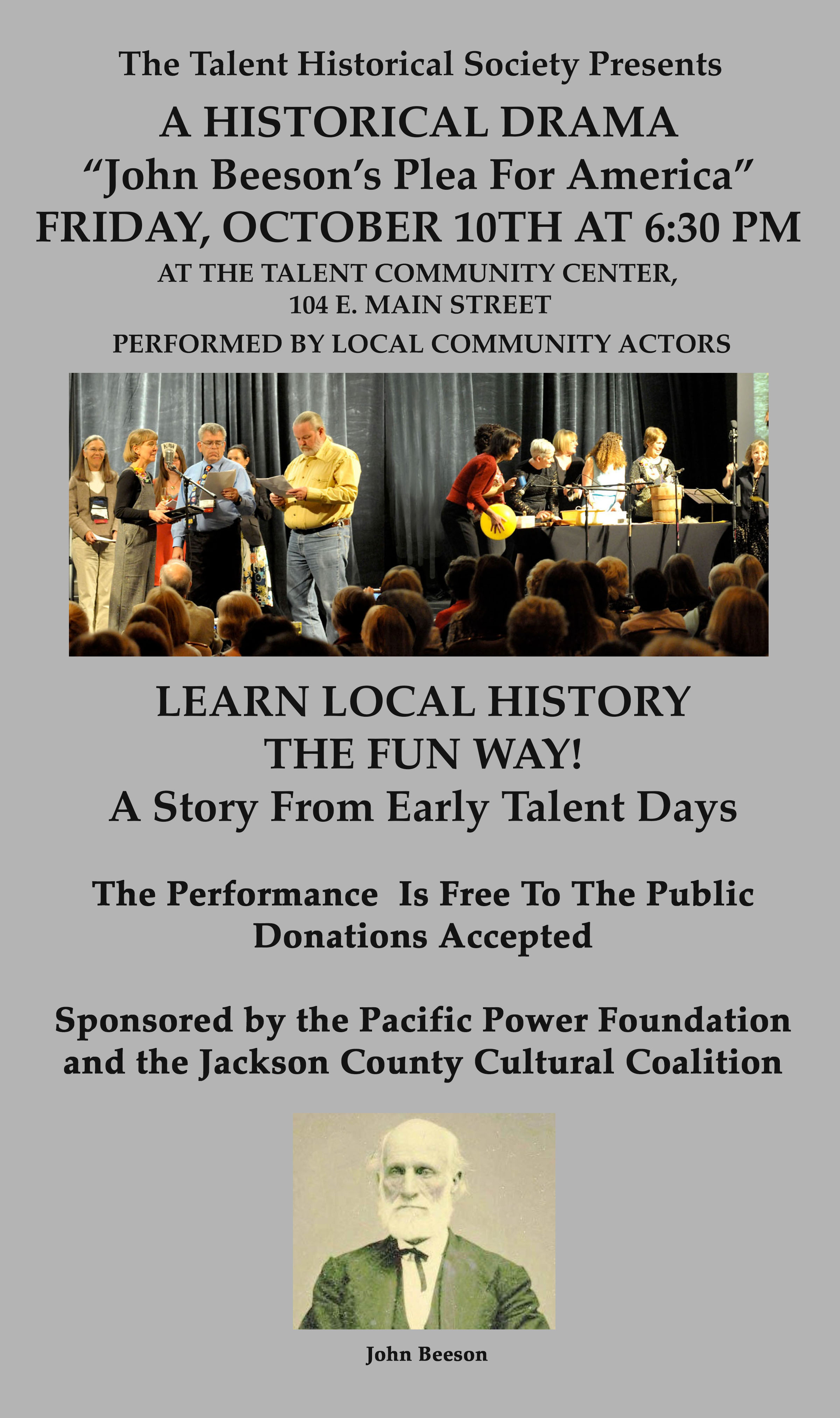 The Talent Historical Society will be holding a special big event to celebrate our heritage at the Talent Museum, 105 N. Market Street and the City of Talent Commons.
