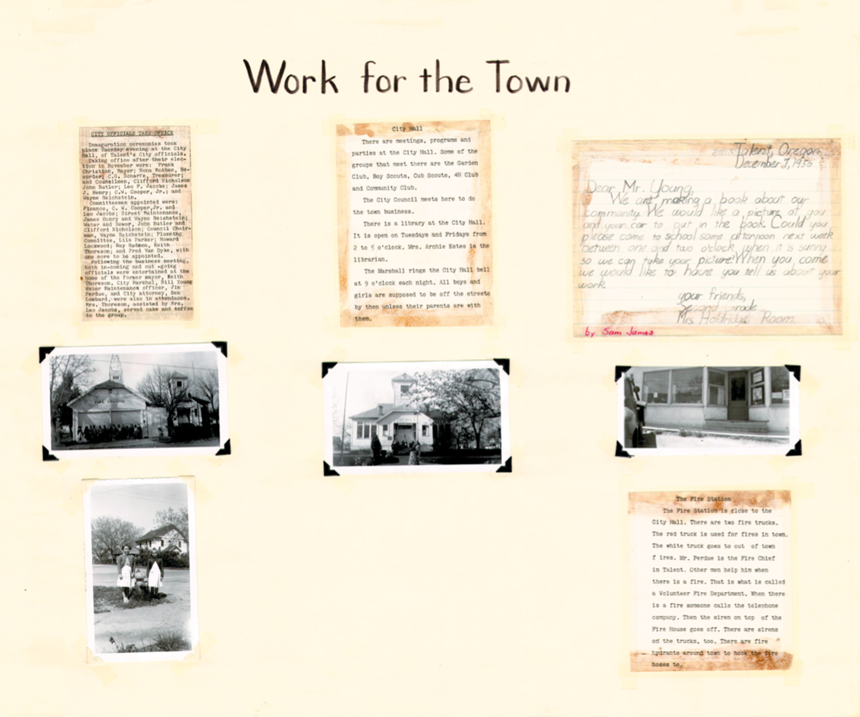 Images of an oversized book, made by revered teacher Genevieve Holdridge, and her 3rd grade students from 1956-1966, documenting the school and the town during that time period have been used as a basis for this curriculum. The book is referred to as the “Flip Book” in the lessons, because it originally hung on a rack so that children could flip the large pages as they went through the book. Three copies of this large book have also been made with the funds. One is at the museum, and the other two will be placed at Talent Elementary School next fall.